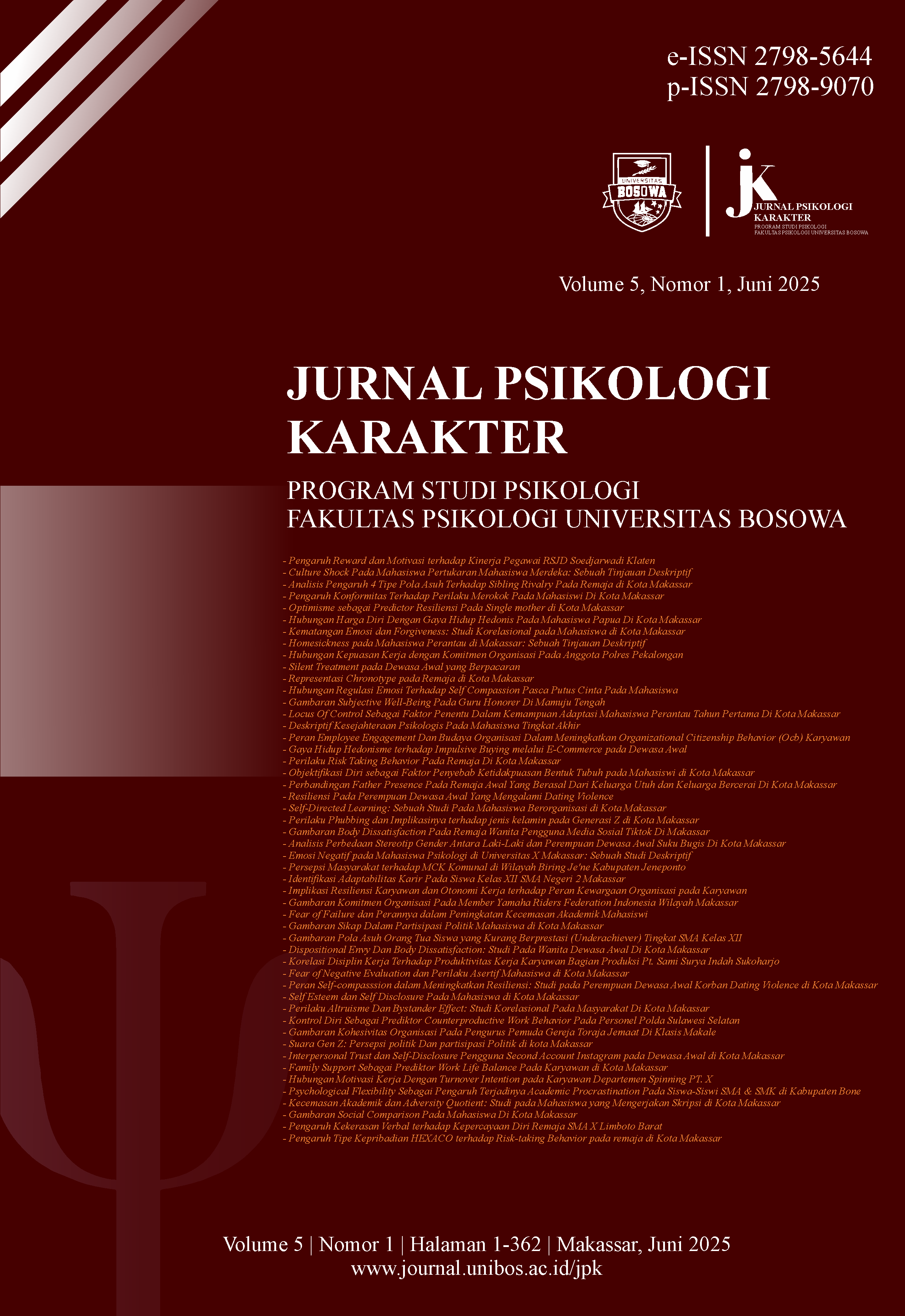 Jurnal Psikologi Karakter merupakan jurnal ilmiah yang dikelola secara peer review diterbitkan oleh Fakultas Psikologi Universitas Bosowa. Terbit dua kali dalam satu tahun.